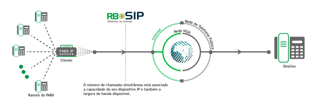 Através de um dispositivo IP (ATA, IP, PHONE, PABX IP ou SOFTPHONE) o número discado é encaminhado via internet para a rede NGN Rota Brasil.